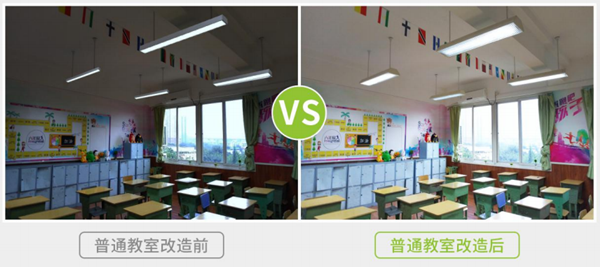 華輝照明設計了專門用于教室照明燈具——led護眼教室燈和led護眼黑板燈,符合國家標準課桌維持平均(恒)照度大于300lx,照度均勻度0.7;黑板維持平均(恒)照度500lx,照度均勻度0.8;顯色指數大于90,色彩還原性高;采用格柵防眩光設計,眩光值小于16,不刺眼;色溫是5000K,舒適柔和;整個教室照度均勻,無頻閃,沒有藍光危害。