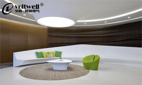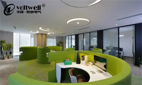 再看看員工格子區——加入了綠色這種能夠舒適眼球、健康心理的色彩元素。方形格子間進化成半封閉圓辦公區,照明部分由方形格柵燈進化為LED平板燈,安裝位置與辦公臺面完全匹配,并通過桌面上的臺燈補齊閱讀時需要的照度。采用亞克力板等半透明材料或拋物面型金屬格柵,能夠降低燈具出光面的亮度。加之安裝位置合理,從而降低產生眩光的機率。