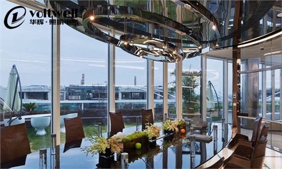 會議室內的橢圓金屬亮面現代造型吊燈,三層同心橢圓向上出光,打到棚上玻璃鏡后全屋將光線漫反射至全空間。這樣的布燈方式,再配合寬大的落地玻璃,通透、自然,能夠完美的形成一種“天為上”的空間感覺。