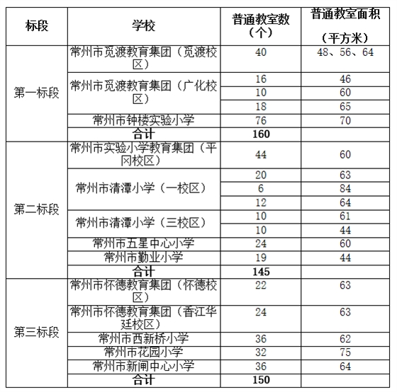 各學校改造教室數量及教室面積詳見下表,各標段的教室數量為預估數,實際以最終結算為準。