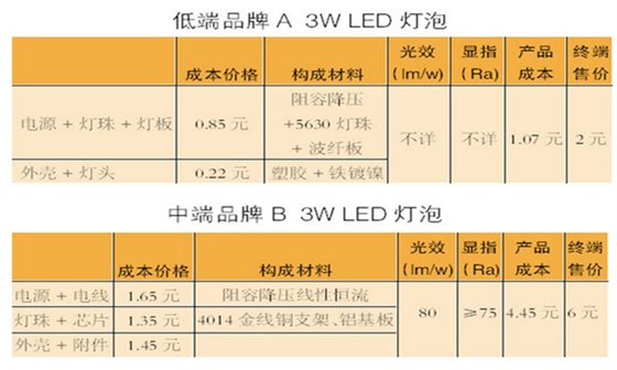 中端3WLED燈泡的材料是阻容降壓線性恒流的電源電線,4014金線銅支架、鋁基板,成本價(jià)比低端產(chǎn)品的高出了3倍,80lm/w的光效等參數(shù)皆有。明顯的中端產(chǎn)品各部件材料價(jià)格都比低端產(chǎn)品高出幾倍,從而終端售價(jià)也高了4元。