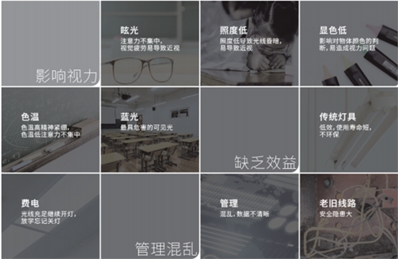 目前教室燈光存在問題包括中小學教室整體照明水平不高,照度均勻度較差,黑板照度及均勻度普遍較低,普遍存在忽視色溫及顯色指數的情況;照明設備老化、照明標準不完善、安裝技術規范更新不及時、照明方案設計不合理等。