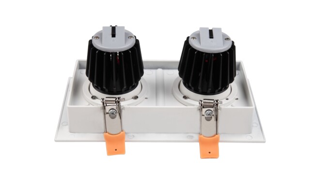 1、G13系列雙頭COB格柵射燈燈體采用優質鋁合金噴涂處理,散熱好,面框為鋁合金沉臺設計,外觀新穎、時尚