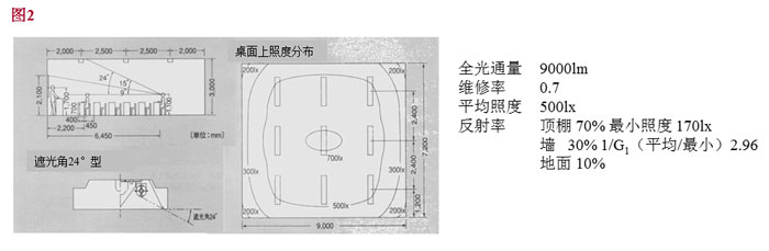 但是,在一面采光的教室里,如圖1所示,桌面上會出現(xiàn)部分區(qū)域(圖中陰影部分)無法保證2%的晝光率,并且教室的靠窗側(cè)與靠走廊側(cè)的桌子上的照度水準(zhǔn)差別大,僅靠自然光無法保證靠走廊側(cè)的有足夠的照度。另外,當(dāng)陰天或下雨天以及冬季的早晚等時候,僅靠自然光無法獲得足夠的照度,即使是晴天時,天空輝度也在時時刻刻變化著,想保證一定水準(zhǔn)的晝光照度是很困難的。